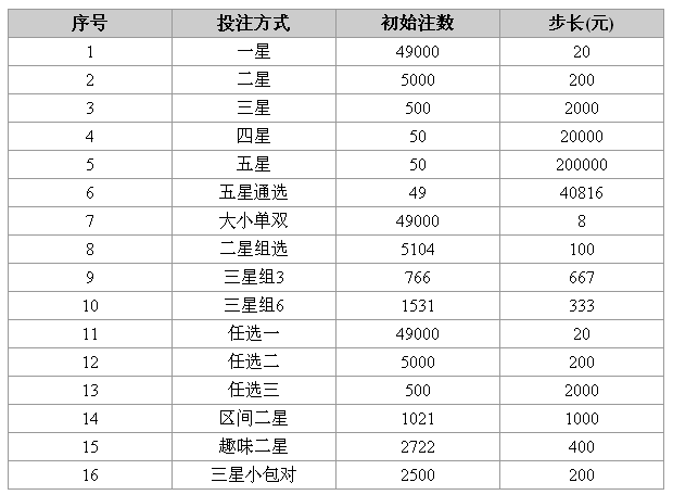 1、初始限制:初始注数是指当某种玩法方式的销售额为零,每种玩法方式下每注玩法号码允许销售的最大玩法注数。步长指销售注数增加一注,某种玩法方式销售额需要增加的金额。具体设置如下表: